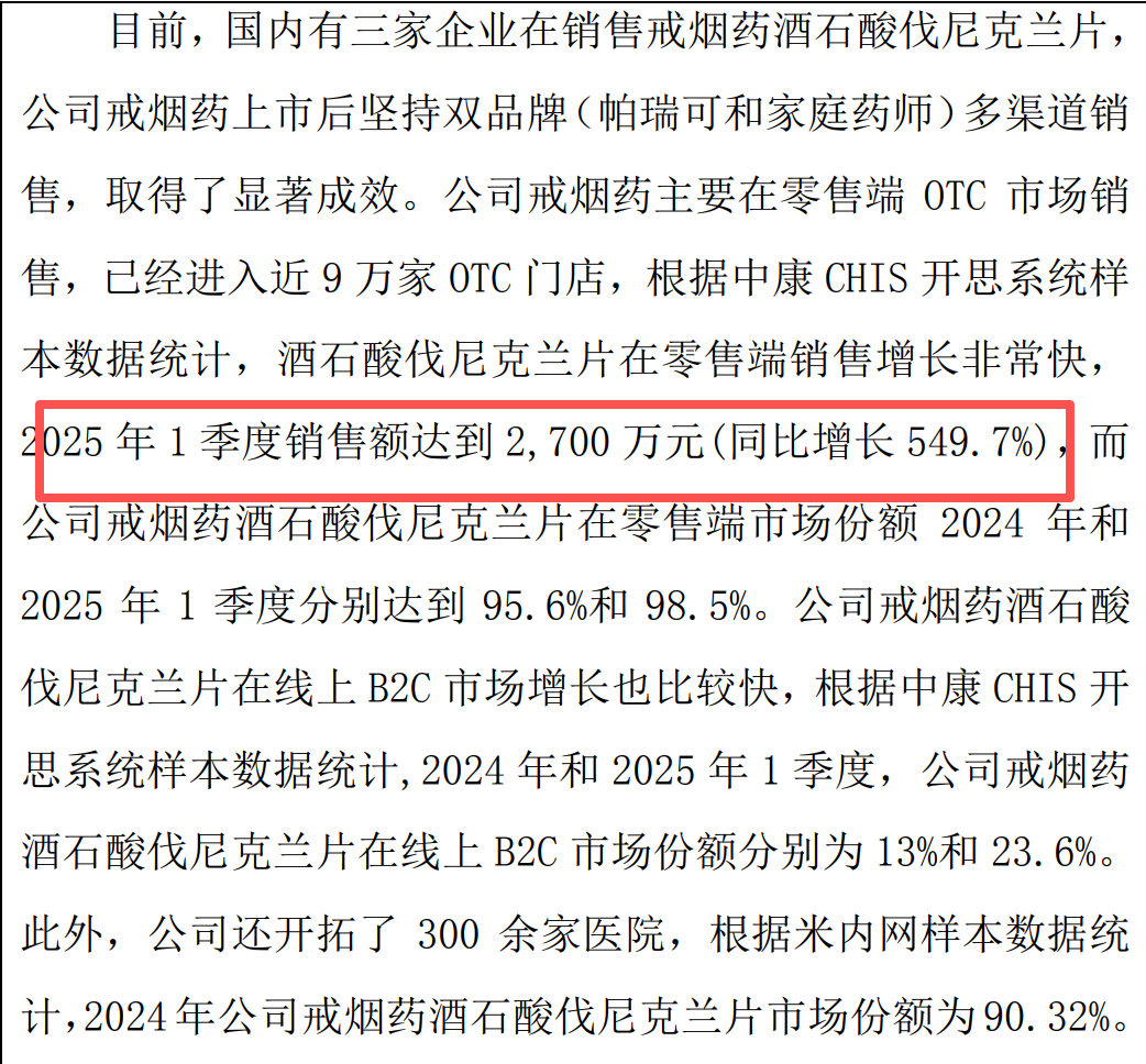 公司现在主打产品是戒烟药酒石酸伐尼克兰片,走势良好,2024年数倍增长,2025年一季度零售额数倍增长,但其实是低基数原因。