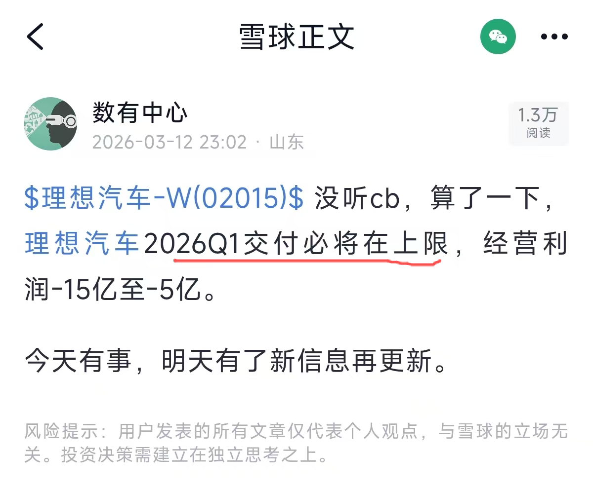 其他因素不变,具体可参考财报后我的文章预计理想汽车2026Q1巨亏,新L9北京车展上市。