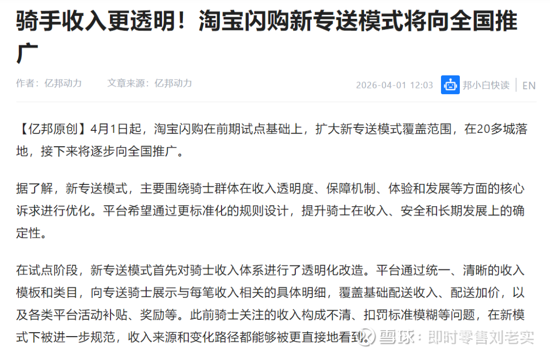 今天,淘宝闪购新专送模式来了。据报道,4月1日起,在前期试点后,淘宝闪购新专送模式首批将覆盖20多个城市,接下来将向全国推广。
