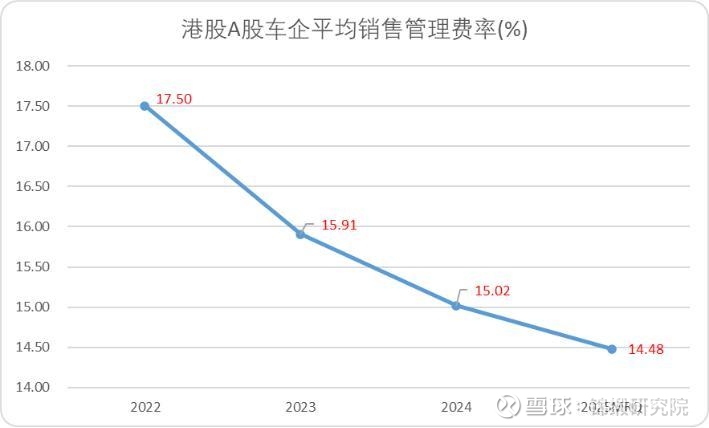 两年前,我们统计了所有上市主机厂的费率,得出了车企毛利率需要突破相对费率均值,才能实现良性正循环。虽然过去两年间,整体的费率有所下降,但截至2025年上半年,上市主机厂管理费率+销售费率的均值依旧达到了14.48%。