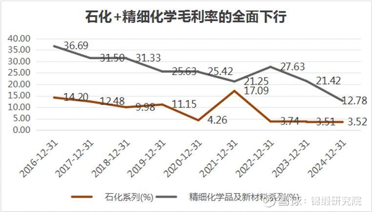 石化业务连续交出多年不到5%的毛利表现;而被内部寄予厚望的精细化工,同样也被连续多年全国产能扩充压得喘不过气来。