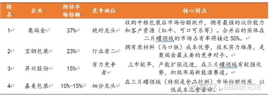 奥瑞金以60.66亿港元(约合人民币55.24亿元)的现金对价,完成了对香港上市公司中粮包装100%股权的并购。此次并购完成后,奥瑞金在国内金属包装市场的预估份额攀升至37%,行业竞争格局得到根本性优化。