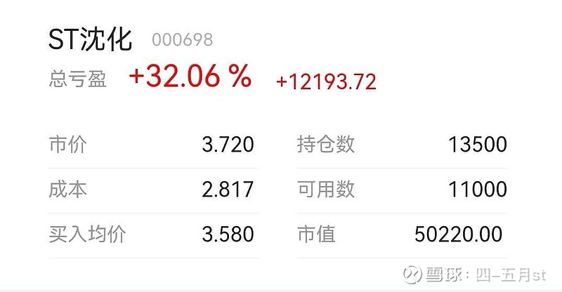 感觉现在的st沈化性价比很高了,我觉得趁这次大盘调整的机会可以买点,拿到明年摘帽,收益肯定不错。我st沈化仓位已经够多了,等金隅集团出来,再把一部分资金切到他上面来,力争今年能有24%的年收益,兄弟姐妹们预祝我成功吧!