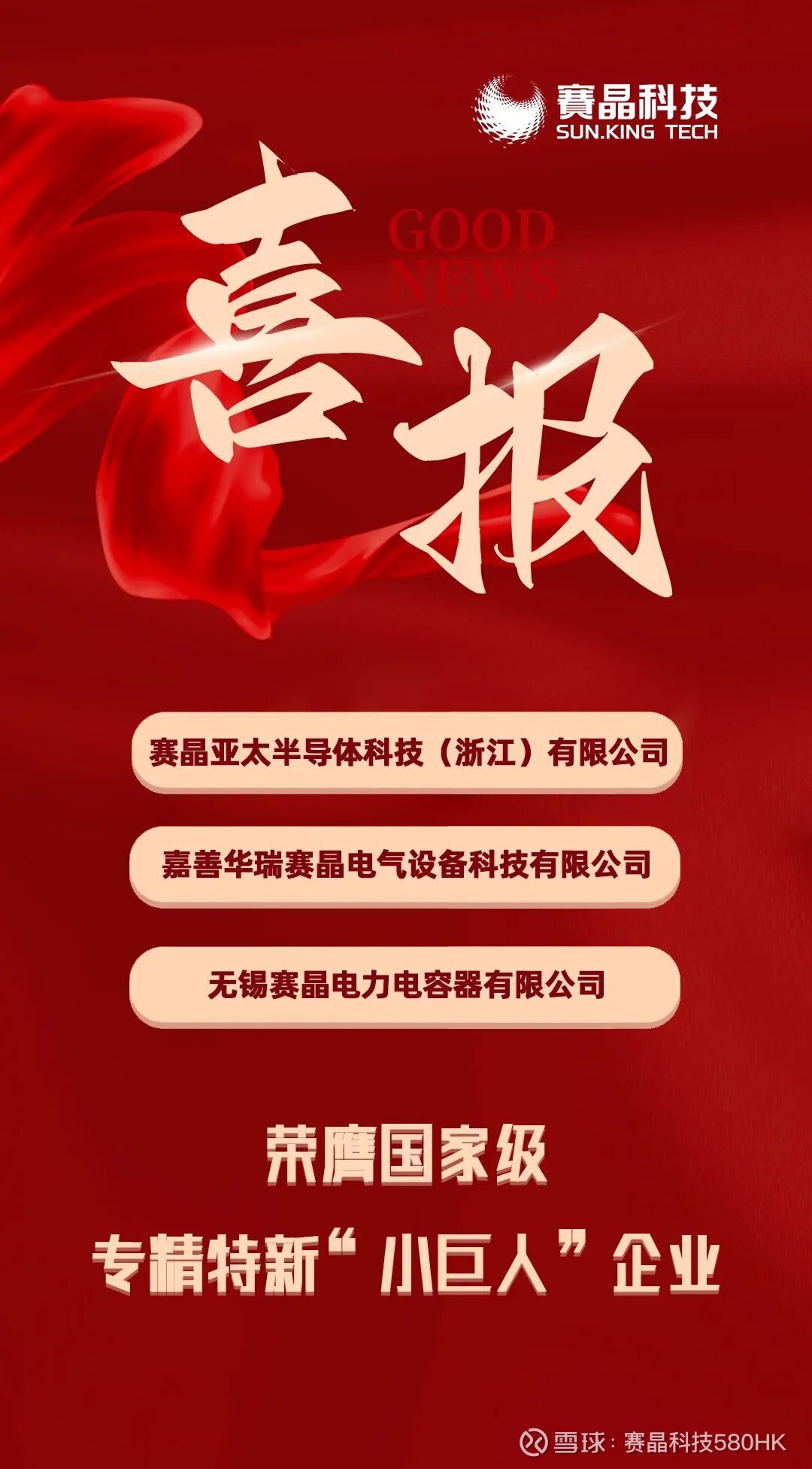 10月20日,国家级专精特新“小巨人”企业最新一批公示名单揭晓。赛晶科技集团有限公司(简称“赛晶科技集团”)旗下赛晶亚太半导体科技(浙江)有限公司(简称“赛晶半导体”)、嘉善华瑞赛晶电气设备科技有限公司(简称“嘉善华瑞赛晶”)、无锡赛晶电力电容器有限公司(简称“无锡赛晶”)成功入选。