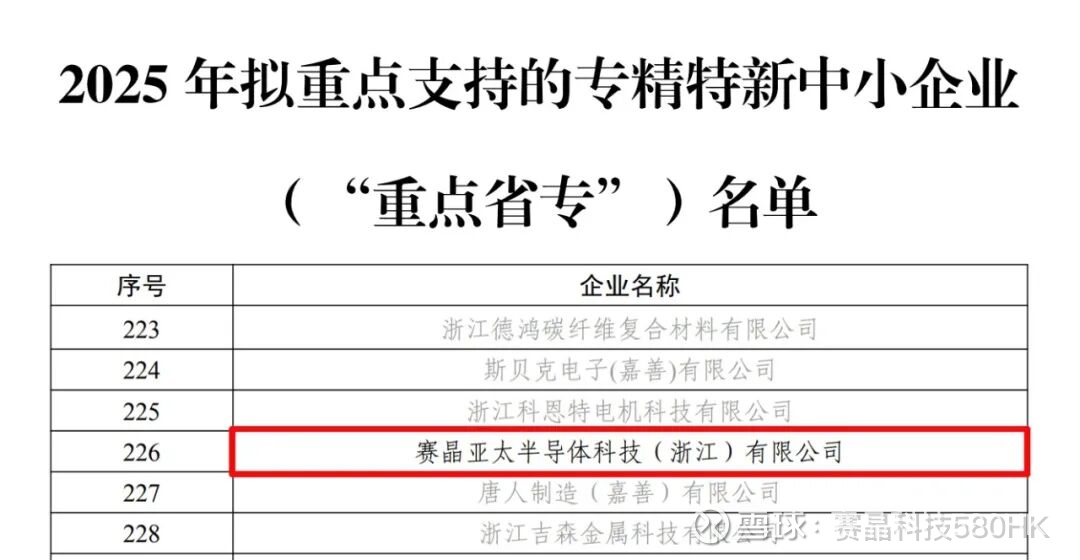 浙江省经济和信息化厅公示了2025年拟重点支持的专精特新中小企业(“重点省专”)名单,赛晶半导体凭借其在功率半导体方面的卓越表现,成功入选。这一荣誉不仅是对赛晶半导体在技术创新、产品质量及市场影响力等方面的认可,更是对公司长期以来坚持自主研发、专注核心竞争力的肯定。