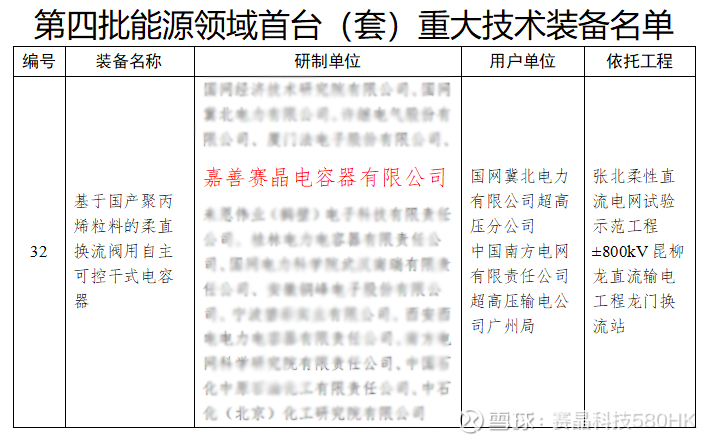 国家能源局公布了第四批能源领域首台(套)重大技术装备,嘉善赛晶电容器的“基于国产聚丙烯粒料的柔直换流阀用自主可控干式电容器”成功入选,此次入选不仅是对赛晶在技术研发和产品创新方面的肯定,更是对其在推动能源装备国产化进程中所做出的突出贡献的高度认可。