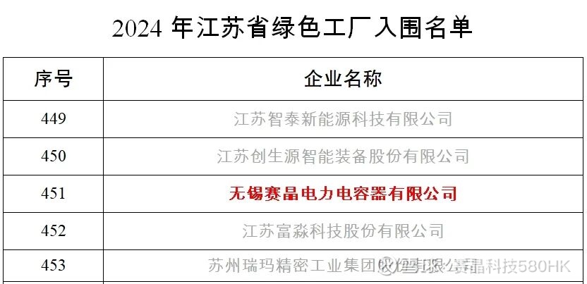 江苏省工业和信息化厅公示了2024年江苏省绿色工厂入围名单,无锡赛晶凭借其在绿色管理和绿色产品方面的卓越表现,荣膺“绿色工厂”称号。赛晶科技旗下“绿色工厂”企业阵营扩至三家。