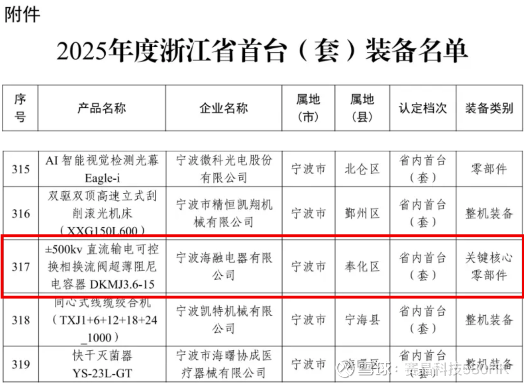 浙江省首台(套)装备认定是对实现重大技术突破、拥有自主知识产权、具备显著市场竞争力的高端装备产品的官方认可,旨在推动制造业高质量发展和科技创新深度融合浙江省经济和信息化厅。赛晶科技通过持续技术创新,已成功实现直流支撑电容器等核心器件的国产化替代,去年成功入选国家能源局首台(套)装备名单。此次入选浙江省首台(套)装备,不仅是对宁波海融电器技术研发能力的肯定,更是对赛晶科技深耕电力电子领域二十余年、持续推动核心装备国产化的高度认可。