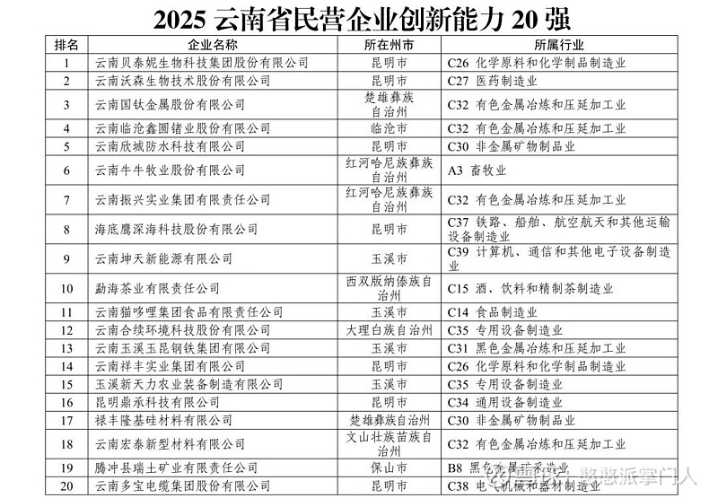 云南省工商联发布2025云南省民营企业创新能力20强榜单,云南锗业位列第四名。
