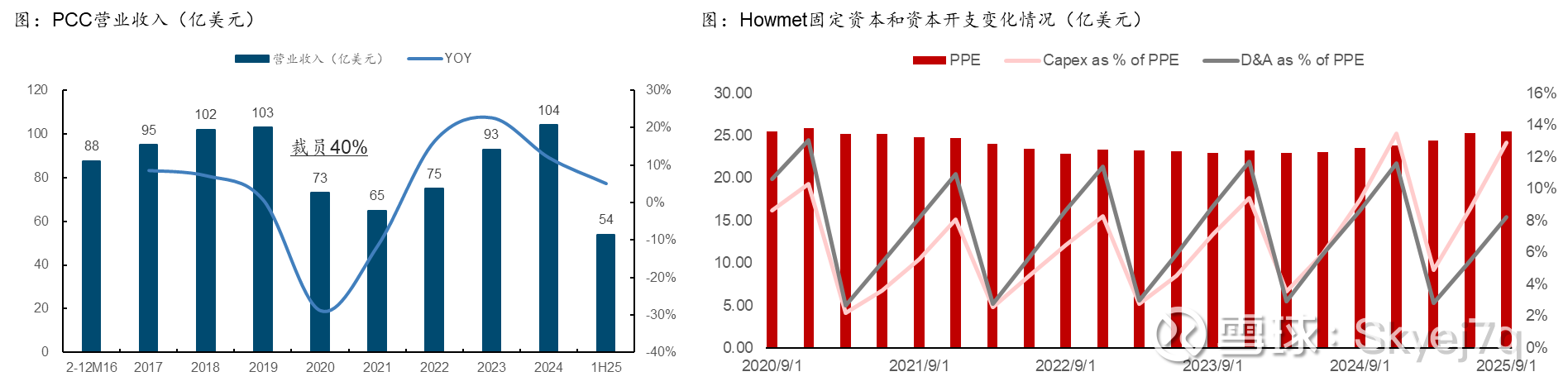2. PCC于2016年被伯克希尔·哈撒韦收购,疫情前后收入变化不大;Howmet于2020年从Arconic分拆上市,近年资本开支提升幅度较小,且更倾向于将产能用于航发叶片,因为航发叶片往往由长协供给,需求稳定R&D效率高且供给同样紧;