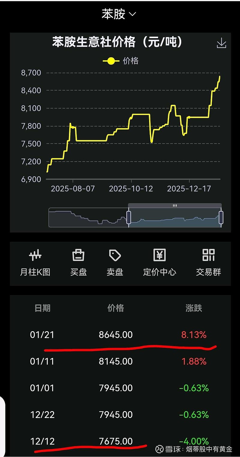 其实苯胺价格比环氧丙烷价格上涨还猛,从三季度7000元到现在8650元,元旦的时候才7945元,现在8650元了