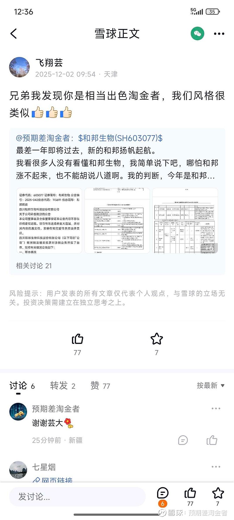 今天忙了一天,很晚才看雪球消息,抱歉回复晚了,芸大。相比于和邦生物的涨停,被我欣赏敬佩的前辈老师点评认可,我是更高兴的。紫金,螺母,藏格,盐湖,招金,无不是您的封神之战,学生也受益匪浅,专注于有色,却又不拘泥于有色的实力大V。祝芸大账户继续新高,我们在宏达股份,继续并肩前行。@飞翔芸