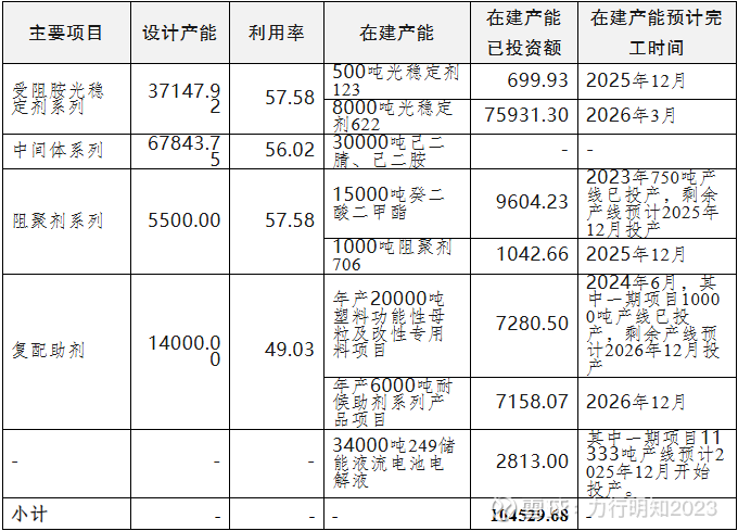 (二)募投项目投产。募投的年产12000吨光稳定剂、5000吨阻聚剂及15000吨癸二酸二甲酯系列新材料项目计划今年年底投产。除此之外,还有“年产30000 吨己二胺系列、10000 吨癸二酸系列及 8000 吨光稳定剂 622系列项目”“年产56000吨耐候助剂系列产品及200吨离子膜液项目”“年产34000吨249储能液流电池电解液项目”等等在建工程。