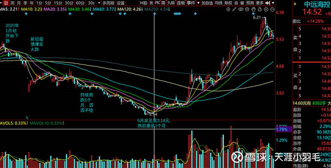 (1)历时时间较长。从1月初开始阴跌,疫情爆发后断崖下跌然后小反弹一下继续下跌,继续阴跌4个月至5月份见底,6月份底部磨盘1个月,下跌过程共计历时半年。