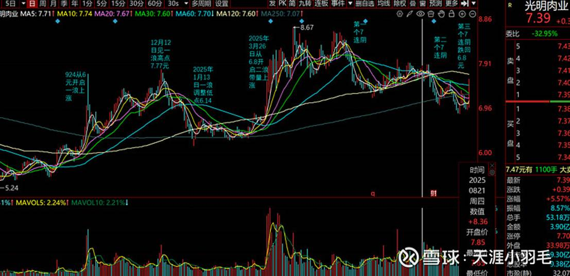 (2)调整幅度大。一般的股上涨趋势中的调整,都是每一浪涨幅调整回一半。而光明肉业不同,上图可见,该股一浪上涨从6元涨至7.77元,而一浪调整至6.14元,基本将涨幅调整完毕;而二浪从6.8元涨至8.6元,而二浪调整跌回6.82元,也基本将二浪涨幅调整完毕。而且二浪调整采用了3个七连阴的打法,实际经历者前2个是8连阴的经历,非常极端!