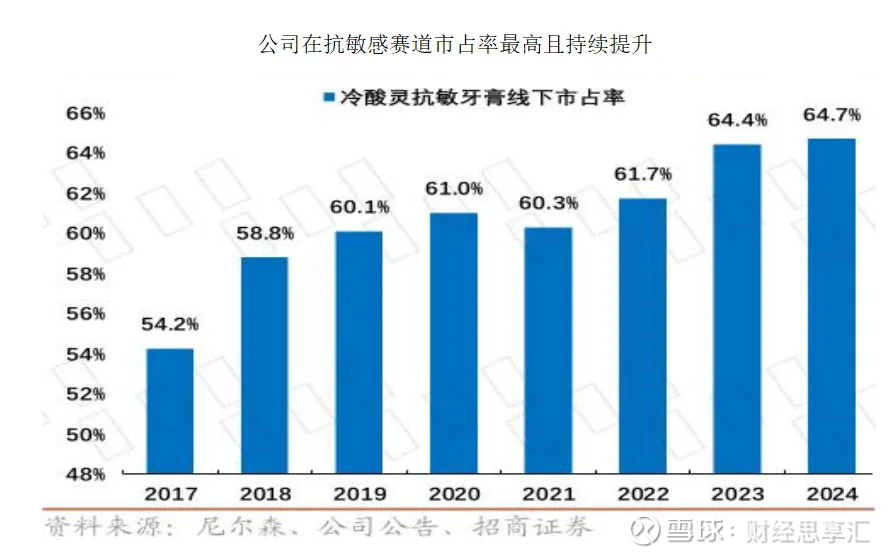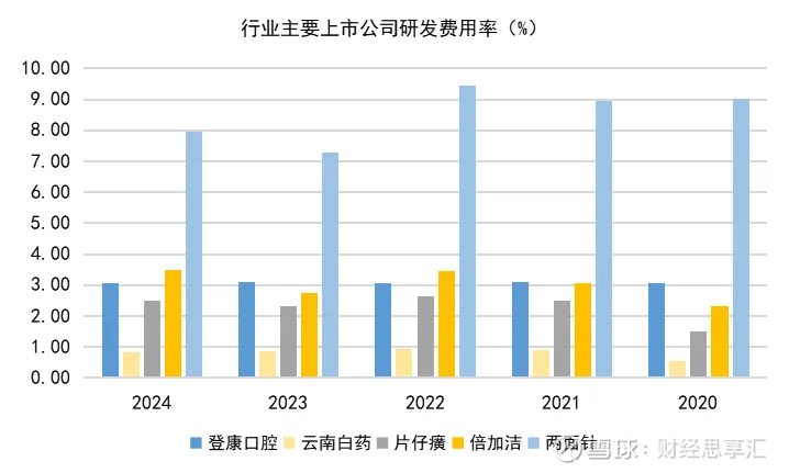 正是基于品牌、渠道和研发优势,登康口腔在功能性牙膏领域保持竞争力。2022-2024年,美白赛道竞争激烈,但牙龈护理、抗敏感等功能品类因饮食与生活习惯变化持续增长。2024年我国线下抗敏感牙膏市场份额为12.71%,其中“冷酸灵”品牌线下零售市场份额高达64.72%,即便是云南白药等竞争品牌加速布局抗敏感领域,仍实现线下份额提升0.3个百分点,稳居行业龙头。