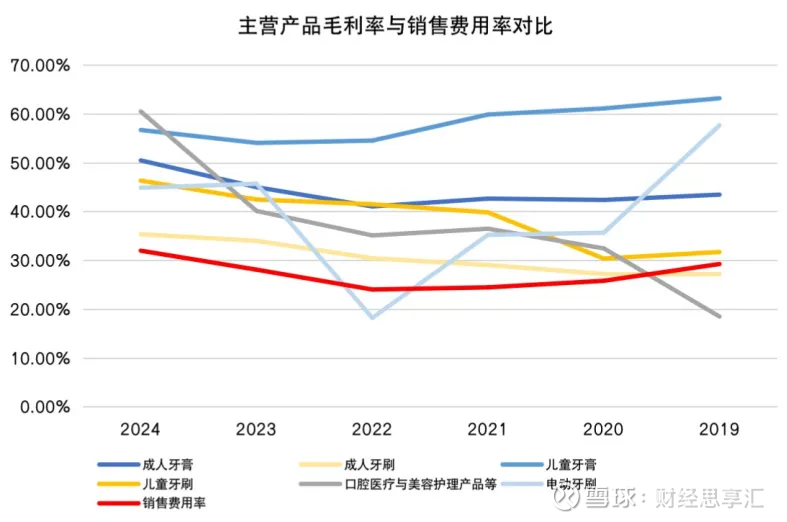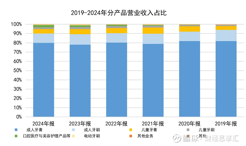 首先,毛利率的改善确实部分来自核心业务。据年报披露,2019–2024年成人牙膏的毛利率从43%逐步提升至50%,成人牙刷的毛利率也由27%回升至35%,而这两项业务合计贡献了约90%的营收。