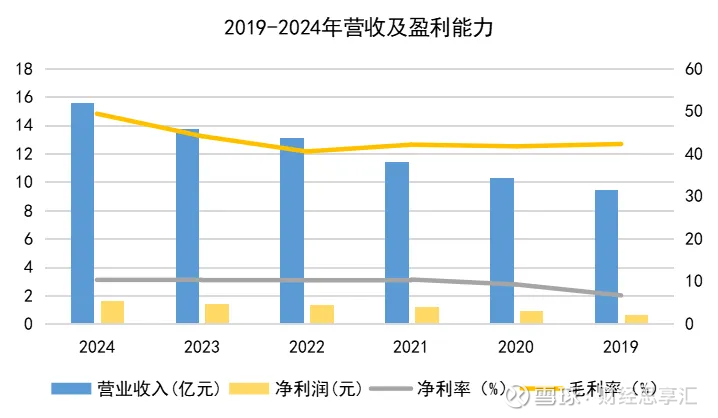从整体毛利率来看,公司在2019–2024年的毛利率由41%左右逐步提升至49%左右,达到近年高点。表面上看,公司盈利能力似乎有所增强。但如果进一步拆解主营业务,则能发现其中存在的结构性问题。