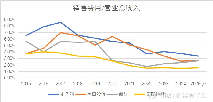 销售毛利率的变化说明史丹利并不是通过降低价格换取的增长。相比于2015年的21.71%,史丹利2025年的销售毛利率为18.01%,降低了3.71%。但是在业绩连涨的年份,史丹利的销售毛利率基本保持稳定。