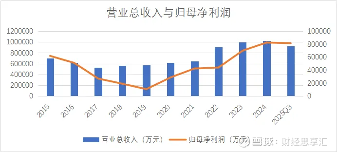 但史丹利的经营情况并不像其赞助的节目一样稳定。2025年10月,史丹利公布了其三季报。报告显示,史丹利的营业总收入达到92.90亿元,同比增长17.91%;归母净利润达到8.15亿元,同比增长22.71%,可以说这是一份“标准漂亮”季报。可查看其近十年的业绩,却发现史丹利的营收情况经历了“过山车”般的大起大落。