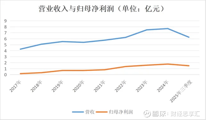 财报显示,2017-2024年,公司营收从4.26亿元增到7.70亿元,归母净利润从0.17亿元增长至1.77亿元。2025年前三季度,公司实现营业收入6.26亿元,同比增长7.39%;归母净利润1.49亿元,同比增长8.83%。