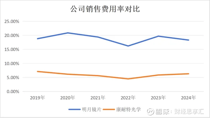 但做品牌另一面,则意味着持续“烧钱”。近年来明月的销售费用率一直处于高位,明显高于同行康耐特光学(02276.HK)。