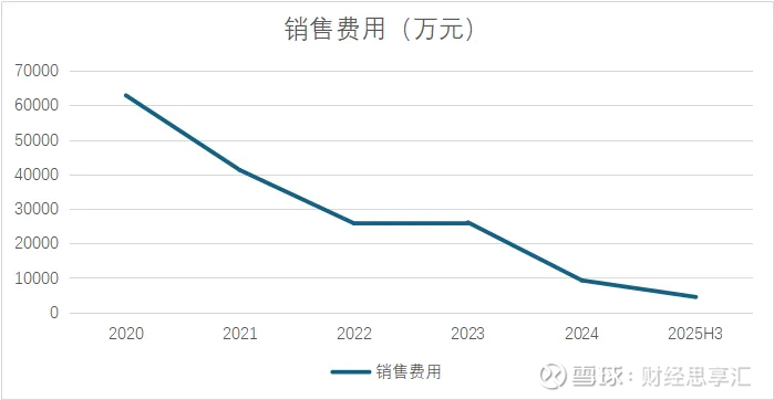 梳理公司近五年的年报,首先是销售费用的断崖式下跌。从2020年的62870.45万元下降到2025年三季度的4447.51万元,不足五年前的十分之一。