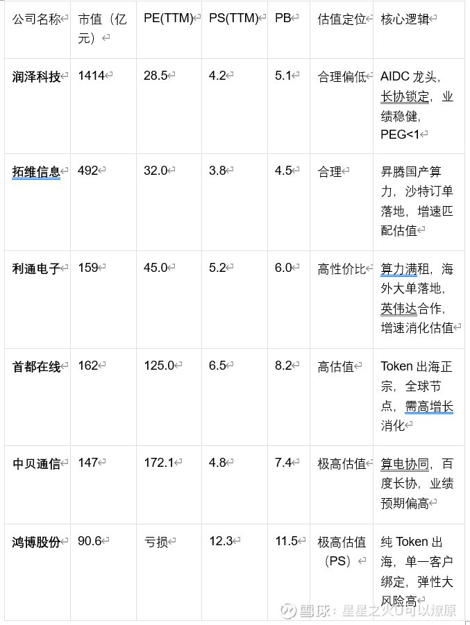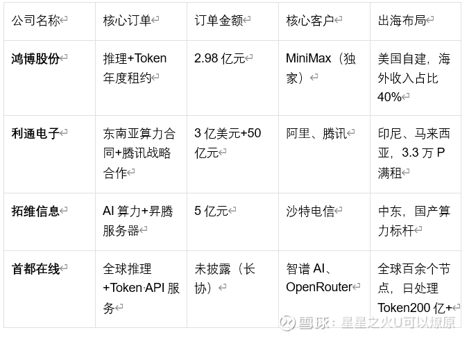 • 模型绑定:深度绑定国内大模型,承接全球Token算力需求,订单稳定,代表:鸿博股份+MiniMax、首都在线+智谱AI
