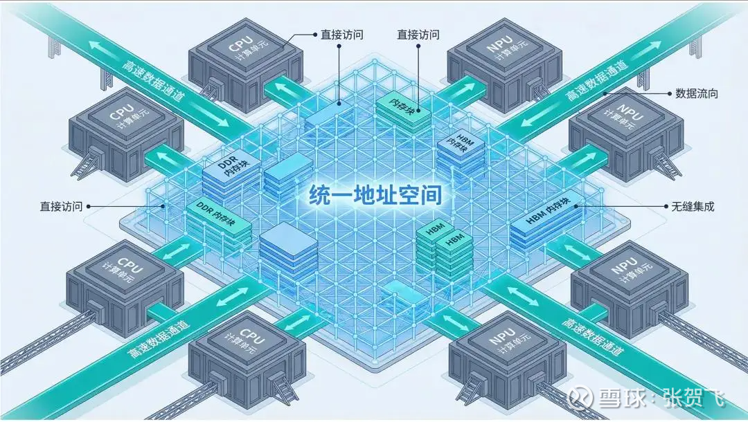 交换芯片扮演了“翻译官”的角色,让CPU、NPU/GPU等设备在统一的协议下互联互通,整合为一个统一的全局地址空间,不管数据存在哪块内存里,都只有一个“全局地址”,CPU、NPU/GPU之间可以直接通过地址访问。