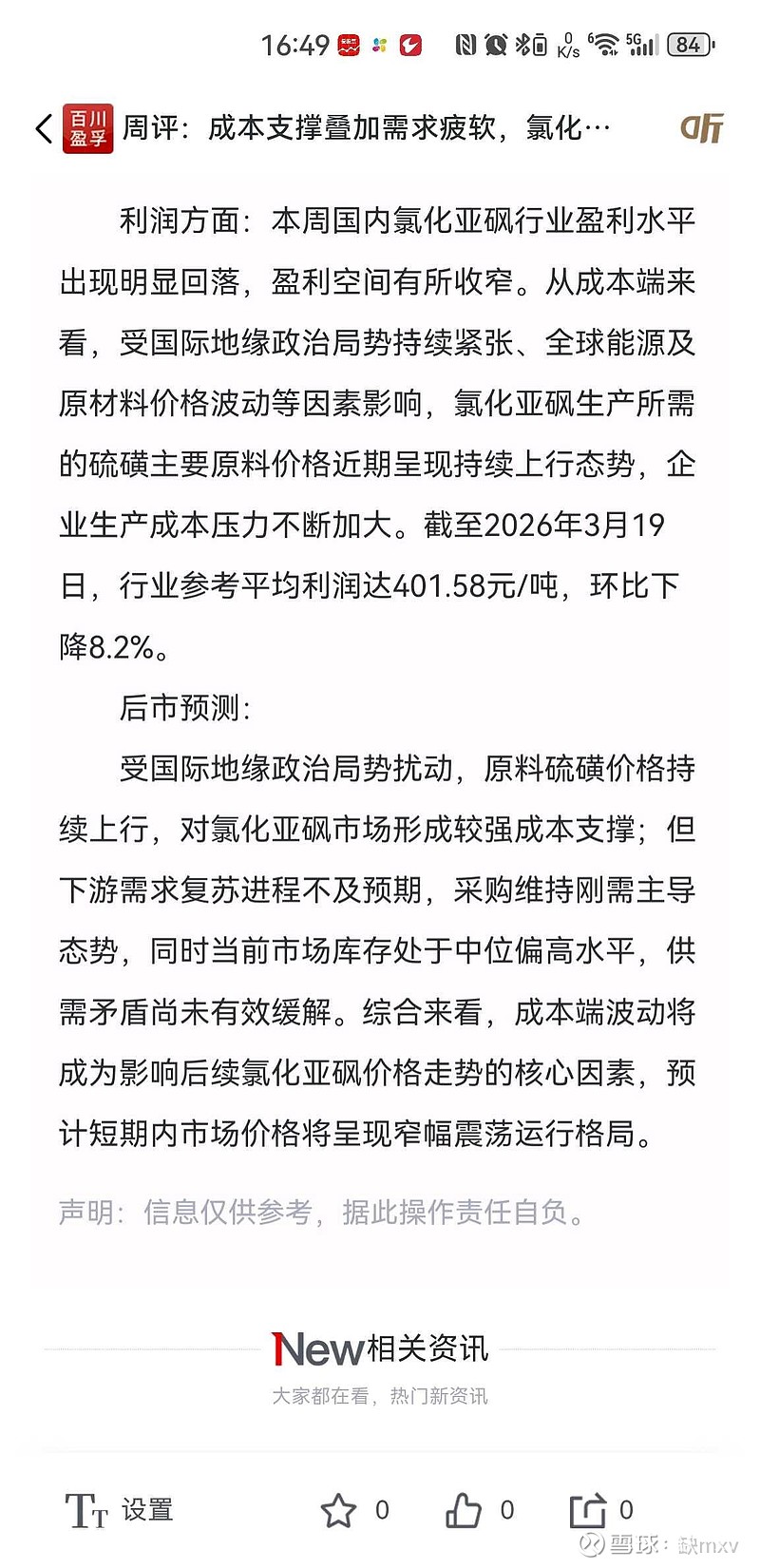 总结:供应端产能利用率较低,硫磺涨价成本增加,利润压缩,下游需求较低,别看价格在高位运行,估计一季度业绩不怎么样
