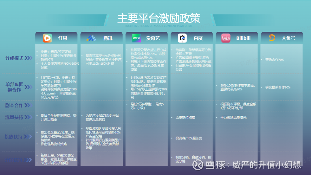 接下来是根据市场上面信息总结出来的现阶段的各个主流平台对于漫剧的政策。可以看到所有主流的平台,都在下场去布局漫剧这个赛道,无论是现在的新兴的红果,还是腾讯、爱奇艺、百度、B站等,也还有一些平台都在积极的进场。