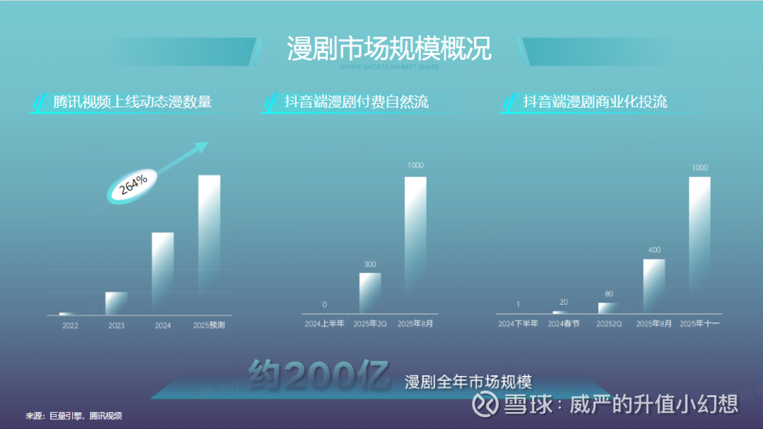 我相信大家在一些公众号,或者说在一些市场讯息当中,也会听到很多关于漫剧的声音。整个漫剧市场大概今年会有200亿左右的市场规模。2022年到2025年,腾讯视频上线的漫剧数量逐年年复合增长率超过百分之两百。2024年的时候,抖音端基本上没有漫剧付费自然流,到了2025年Q2,这个数字大概是300万一天,8月份达到顶峰,变成1000万一天。2025年,抖音端漫剧商业化投流的数据突破了一天1000万。