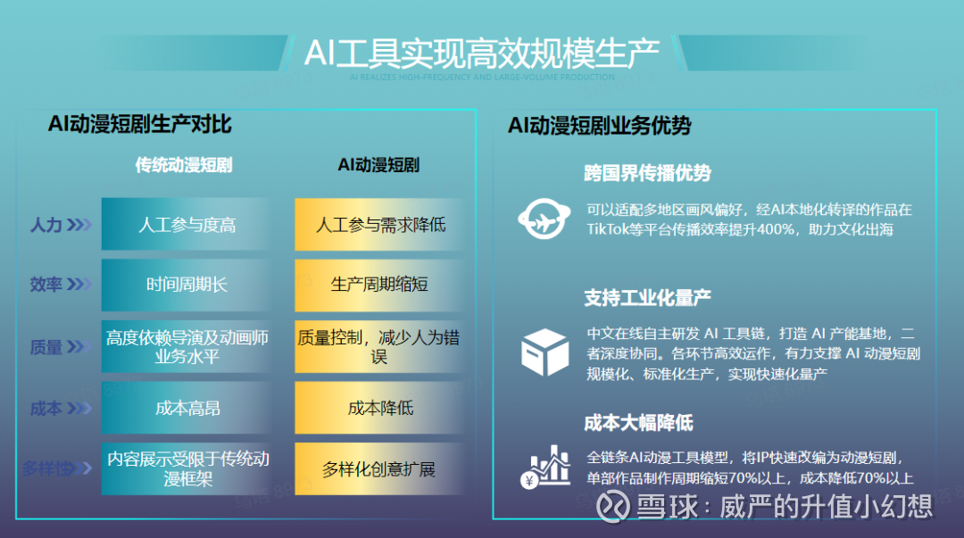 我们也对AI动漫短剧的优势做了总结和梳理,我们觉得它和真人短剧相比,有跨国界传播的优势,比如一个真人短剧想要跨肤色、跨语种进行传播的时候,相对来讲还是有些难度的。动漫短剧因为是二次元的内容,在这方面有些天然的优势。