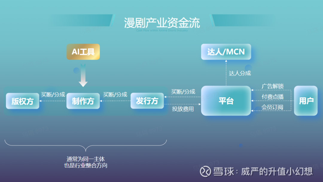 通常来讲会有一个版权方,类似IP故事的拥有者,将版权授权给到制作团队,制作团队再把漫剧制作好交付给发行方,发行方和平台进行对接发行漫剧;买量投流的公司也会和达人、MCN进行分销,通过平台自然流、商业化投流触达用户,包括自然流、商业化投流几部分,用户可以进行主动的搜索在平台上观看到漫剧内容,达人、MCN也会围绕在平台和用户之中做一个纽带。通常来讲,版权方、制作方、发行方有可能会整合成为同一个主体,中文在线目前也是涵盖了版权制作和发行这几个工作的。