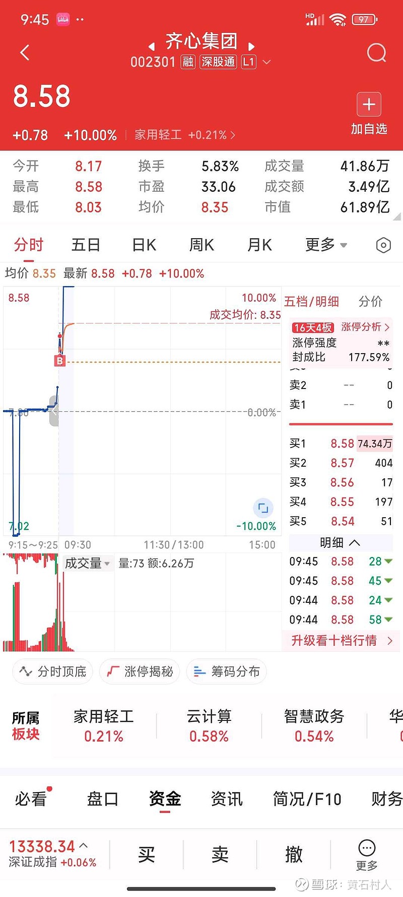 $兆龙互连(SZ300913)$ 误我大事,尽管昨天下定决心开盘就要卖出300913,但是开的太低了,下了单硬是舍不得按确认键。结果结果集合竞价出来,唯一看中的一个股票$齐心集团(SZ002301)$ K线形态非常之好,想买没有钱,账号里只有几千块。后来913虽然涨起来了,减了一半,但是齐心集团已经涨停了。错失良机。不得已回补了万大哥,昨天卖掉的三千股,今天补了同样的数目。