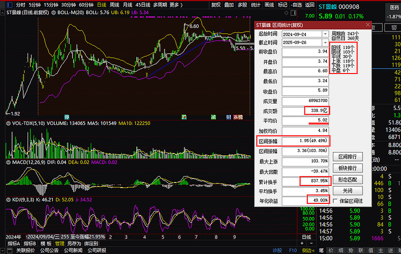 景峰在这个区间涨幅49%,远低于个股平均值,也跑输中位数。也许大家记忆最深的还是那会儿千股涨停,而景峰是全市唯二跌停的个股之一,原因无他,因为前面暴跌过后反弹的太猛了,一鼓作气,再而衰,三而竭。仔细看,2025年ST板块截止今天上涨43.05%,景峰25年涨幅仅仅20.45%,也是远远跑输了板块的。不说那些翻了10倍以上的大牛股ST宇顺之类的,就是那些同批次开始预重整的*ST亚太,今年也已经翻了2倍多。