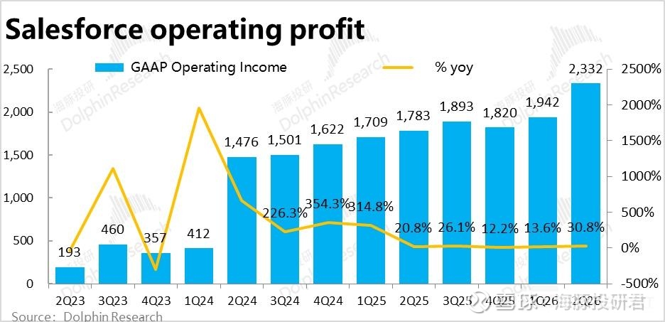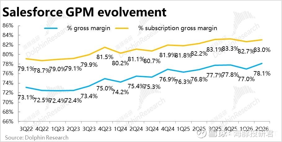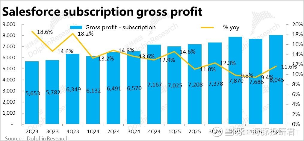 毛利层面,本季 Salesforce 的核心业务-订阅性收入的毛利润$80.5 亿,同比增长 11.6%,小幅跑超对应收入增速。