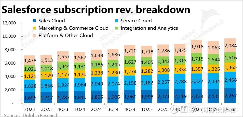 2)更具体看,依旧是商贸和营销云增长最弱,同比仅增长 4%,两大最基石的销售和服务云增速则都在 9% 上下,算是表现平稳。