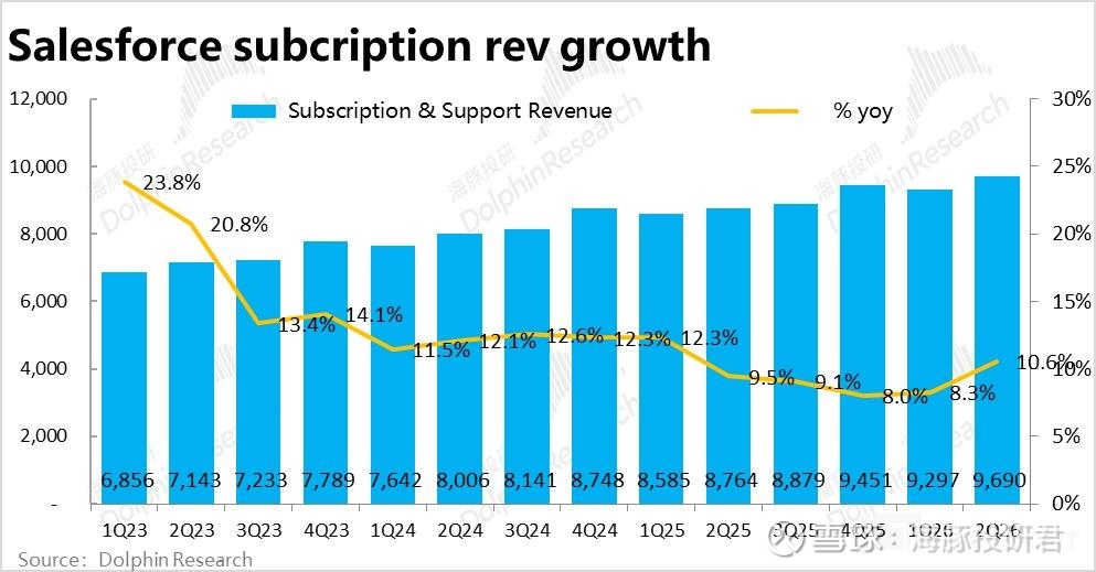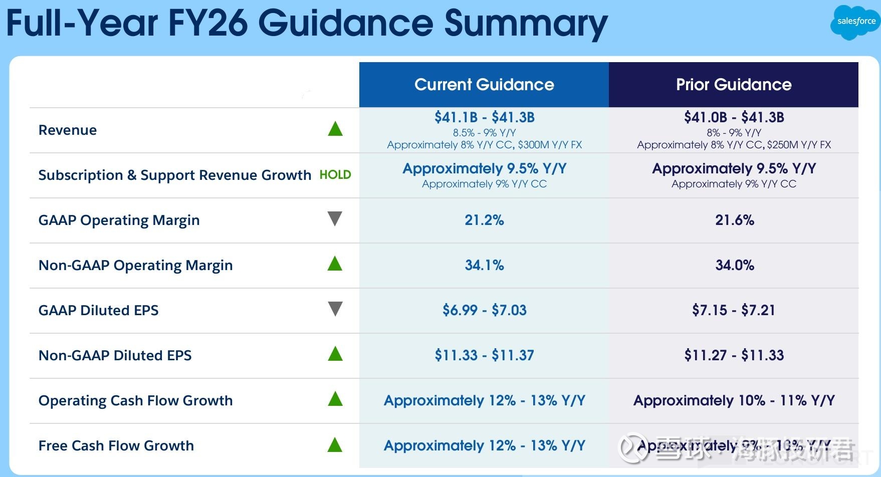 9 月 4 日早美股盘后,SaaS 龙头$Salesforce(CRM)$ 公布 2026 财年 2 季度财报。当季业绩表现相对平稳(或者说平淡)。增长并无明显提速迹象,但靠优秀控费仍挤出小超预期的利润。但不改变核心问题,且对下季度指引也不亮眼,整体观感还是骗弱。详细要点如下: