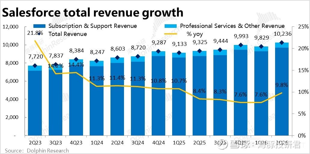 本季专业服务收入约 5.5 亿,依旧同比萎缩约 2.7%,表现和上季同样差距不大,因此Salesforce 本季总营收$约 102 亿,同比增长 9.8%,剔除汇率影响后增速为 9%,较上季小幅提速约 1pct。