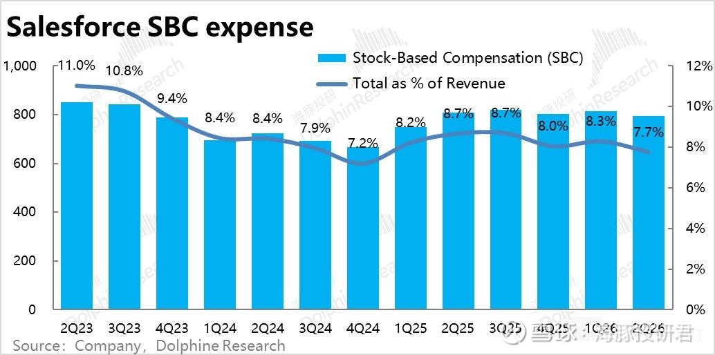 费用角度,本季Salesforce 全部经营费用支出$56.6 亿,同比增长 5.2%,较上季度 6.8% 进一步放缓,也明显低于收入和毛利的增速。因此在增长端表现并不算亮眼的情况下,靠控制费用仍是能挤出一些利润。费用率较上季环比走低近 2pct。