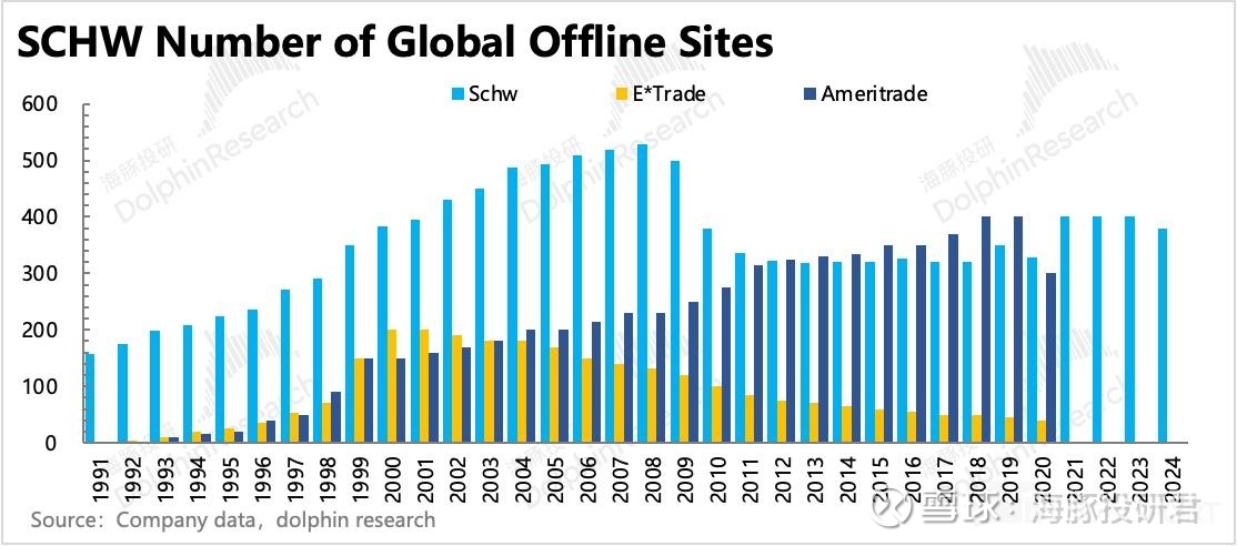 在创立的前5年里,逐步开了18个网点机构,随后加速完善线下网络。截至今天,嘉信一共有380个分支机构遍布全球。而1990年初,嘉信当时的最强竞对——互联网券商往往对线下网点天然不够重视。但在用户适应技术更替、熊市蔓延的关键窗口期,线下网络能够给到用户更多的服务和品牌信任。直到1990年末,E*Trade、Ameritrade两家才加快铺设线下网点。