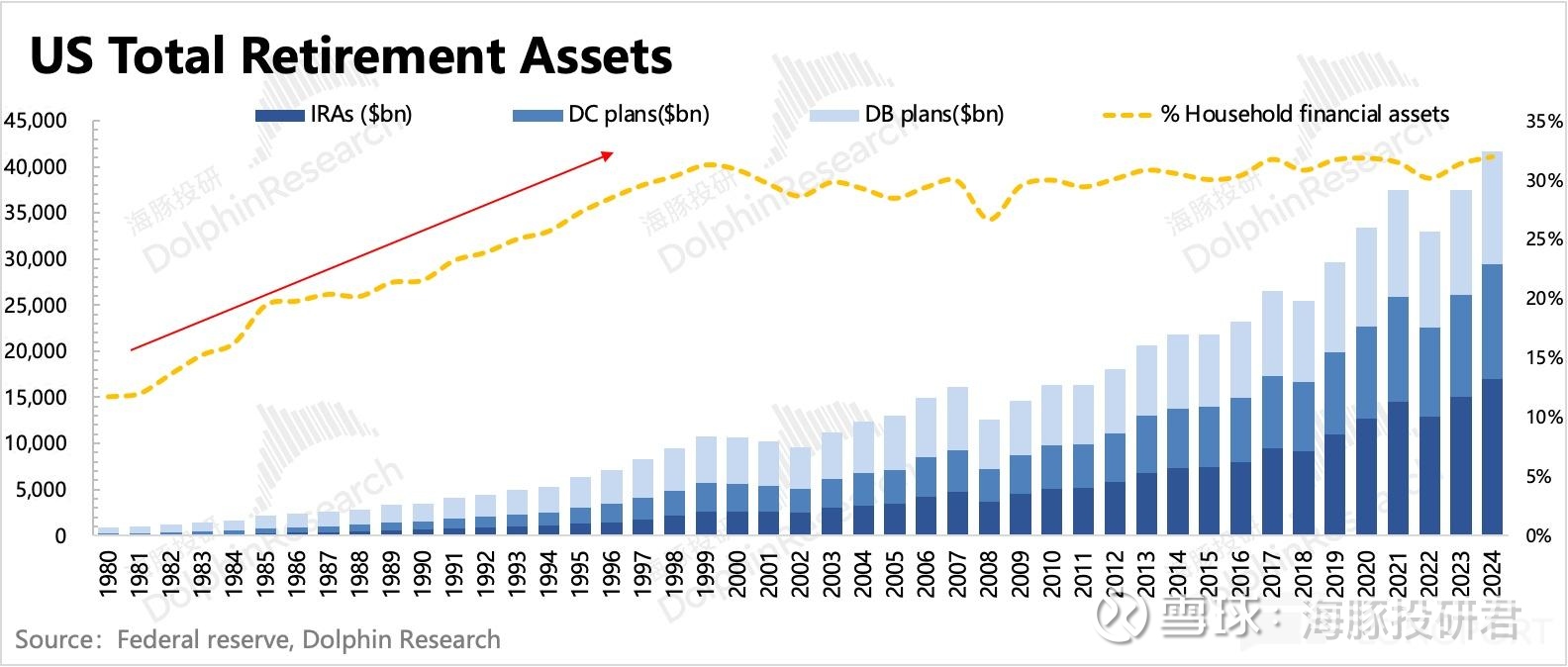 而同期的婴儿潮群体也已经迈入20-40岁,工作过一段时间也开始有了一些积蓄。而组建家庭后持续增长的消费需求,也使得该群体对财富增值有更强的主动意愿。与此同时,1974年美国个人退休账户(IRA)推出、1982年使用范围扩大,和后来推出的401(K)企业员工退休账户(属于下图中的DC Plans),这部分主要退休后才能取现使用的资金,进一步了激发普通大众的长期理财意识。1990年末,养老金逐步成为家庭金融资产中占比30%的重要组成部分。