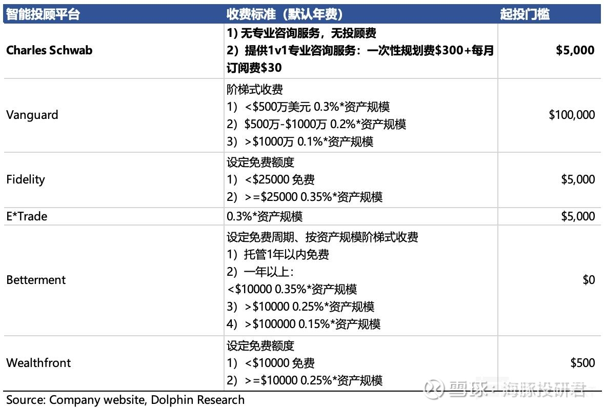 但除了“人工投顾”外,另一个绝佳的创新,就是嘉信于2015年领先市场推出智能投顾服务,通过提供更低门槛的投顾服务(免费+起投规模低),捆绑住大部分普通收入家庭的财富管理需求。