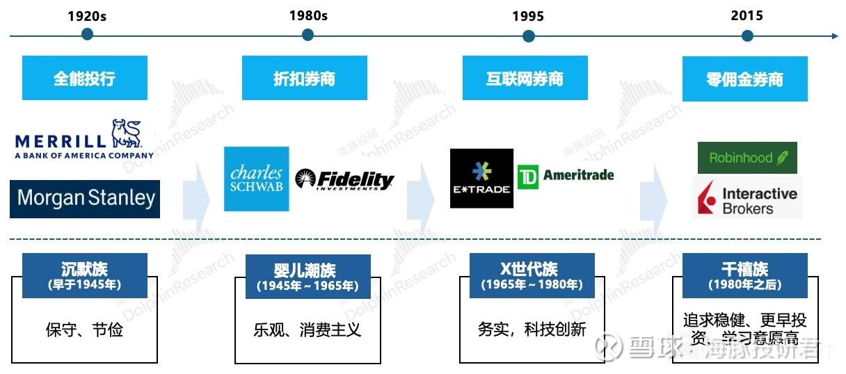 一代人有一代人的券商。在Robinhood的深度研究中,我们提到了券商用户代际转换的特征。美国三代券商的变迁——全能券商、折扣券商、互联网券商、零佣金券商,分别对应了沉默族(1945年之前出生)、婴儿潮族(1946年-1964年出生)、X世代(1965年-1980年出生)、千禧族(1980年之后出生)成为社会主角。