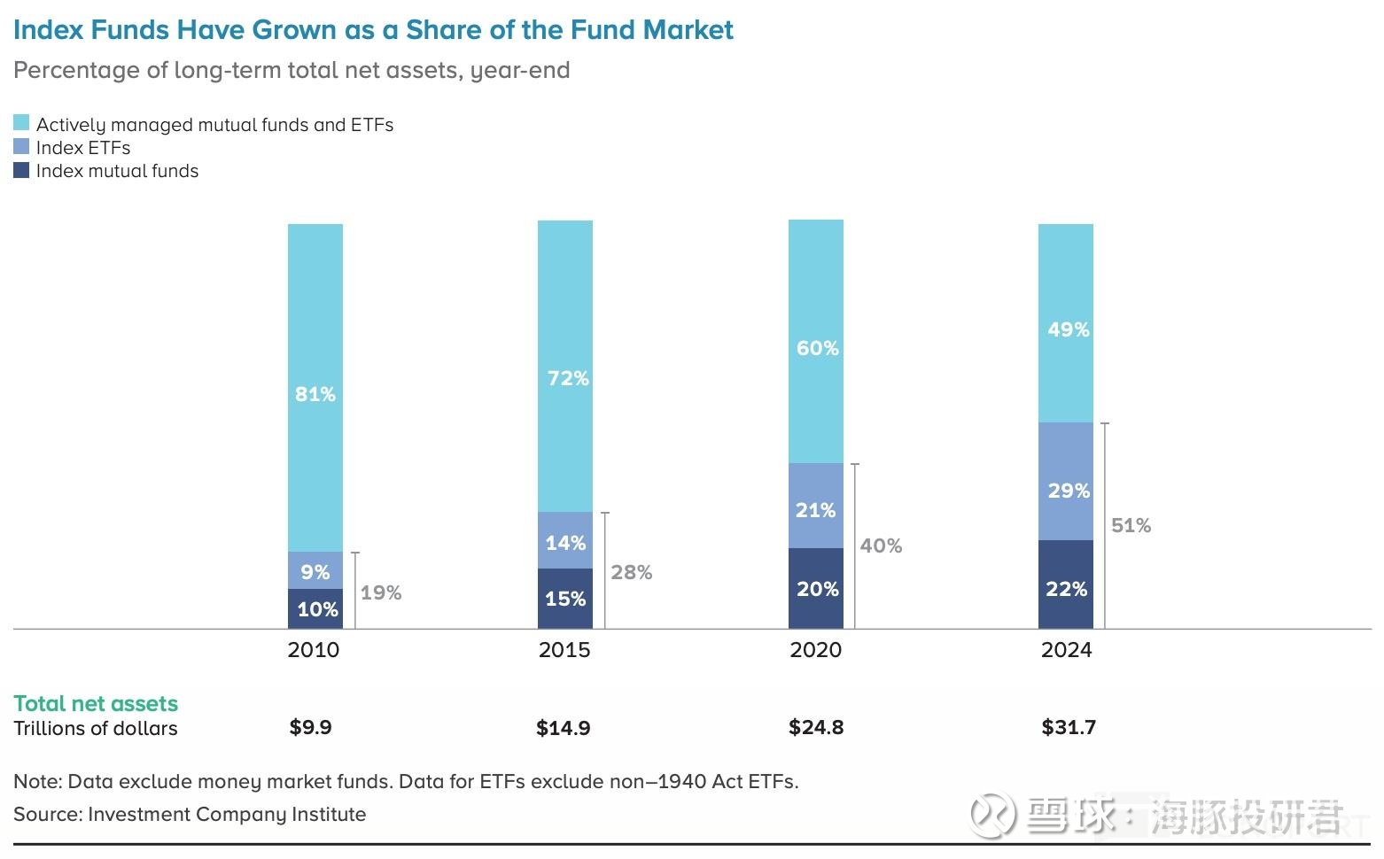 被动指数基金ETF除了早期靠“性价比”优势一炮打响外,伴随着养老金入市、在2010年之后的智能投资热潮,以及美股本身的长牛环境下持续高歌猛进,从1990年增长至今11万亿的规模,多年的CAGR增速超20%。其中费用最低的被动指数ETF基金在整个基金资产池中占到30%。