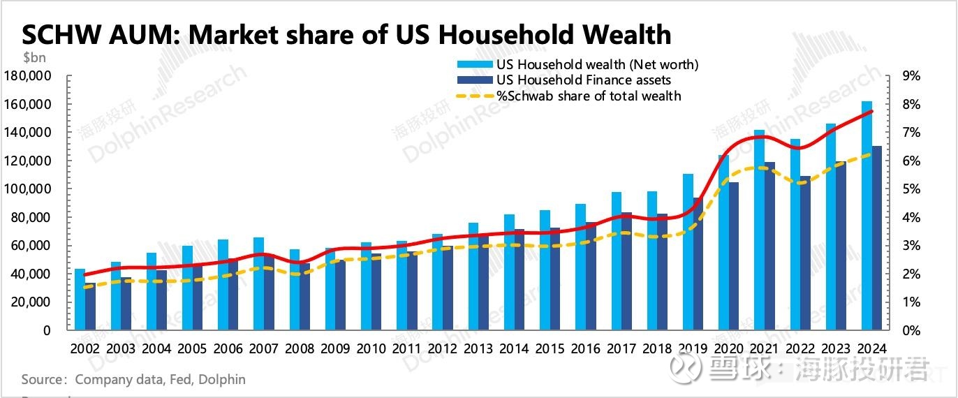 2024年末,嘉信托管的客户总资产规模近10万亿美元,99%是美国用户资产(2024年投资者日会议:国际用户资产规模920亿美元)。这个规模体量,位居行业前列。过去二十年,放在全民超160万亿的财富大盘中,嘉信市占率一路水涨船高已经超过6%,如果只看金融资产的范畴(财富资产中剔除房屋、商业资产),那么嘉信平台上的金融资产规模,占到市场的8%。