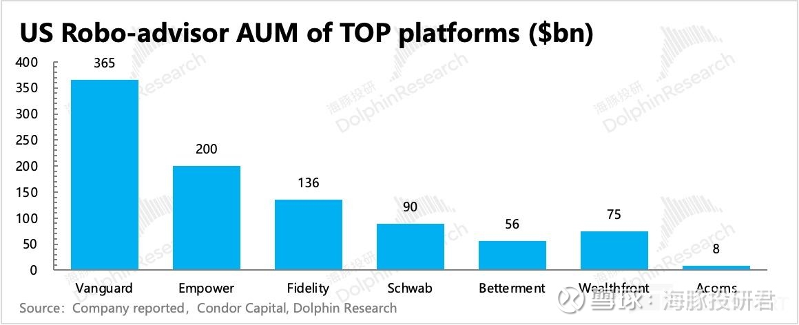 目前嘉信已经成为美国智能投资领域的头部平台,竞争对手包括综合金融机构如Morgan Stanley,财富管理老对手Fidelity、Vanguard以及新兴平台Betterment和Wealthfront。
