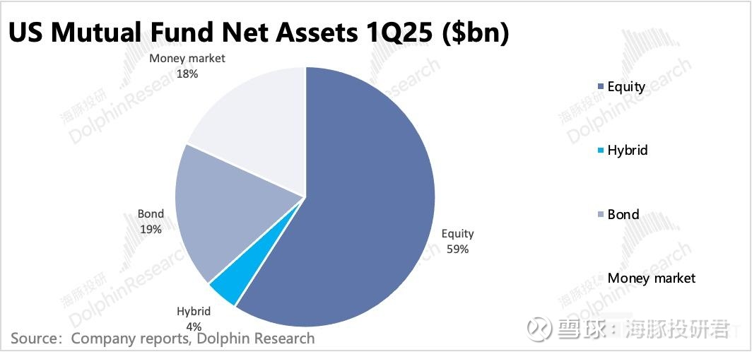 截至2024年末,美国共同基金达到39万亿美元规模(包含FOF则为42万亿),是全民财富的26%,在居民金融资产中占比30%。全行业存续基金10678只(包含ETFs),共同基金以股票基金为主,占了近60%。