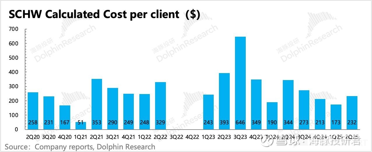 也正是“财富管理”的标签逐渐深入人心,嘉信已经跟随核心用户的财富积累,通过不断丰富相应的产品服务,无需太多额外的推销,即可自然向更广泛和更富裕的阶层渗透。近几年,嘉信的获客成本相对稳定,用300美元拉来的是一个净新增用户平均20万美元入金。Q2业绩电话会上,管理层提供了目前高净值客户的渗透率情况:“美国每6个资产超2000万美元的高净值家庭中,就有1个家庭选择了嘉信。”